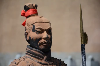 蓝天下都匀秦汉影视城仿古建筑人像雕塑