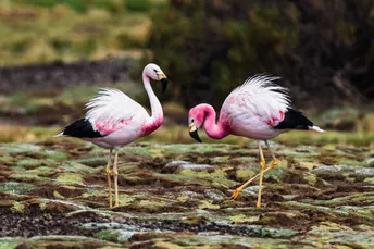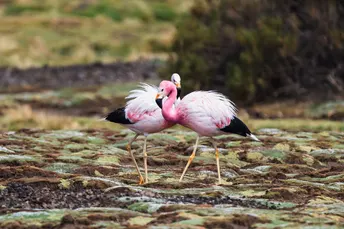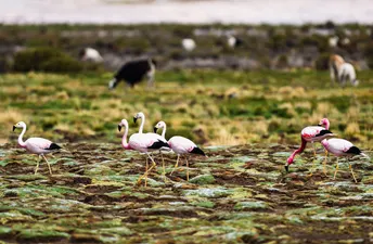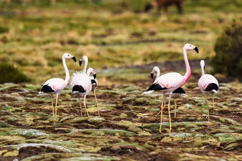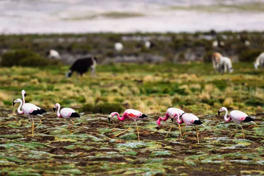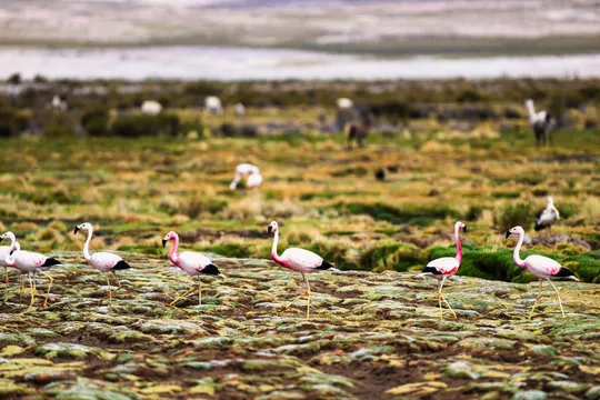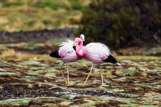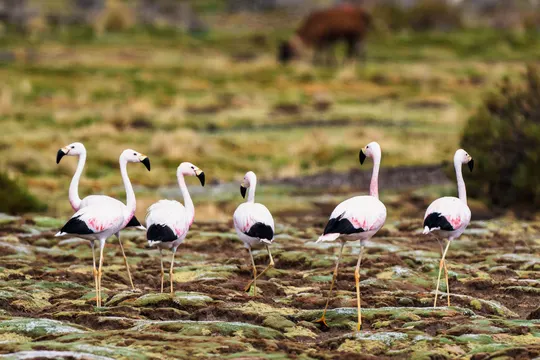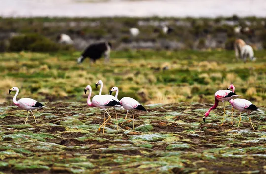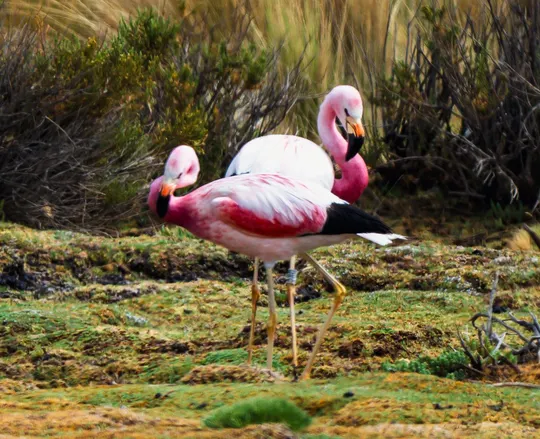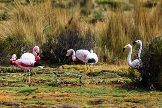 安第斯火烈鸟(学名:Phoenicoparrus andinus)是玻利维亚及安第斯山脉高原地区特有的火烈鸟物种之一。这种火烈鸟主要栖息在玻利维亚、秘鲁、智利和阿根廷的高海拔盐湖和湿地中,是安第斯地区生态系统的重要组成部分。 特点: • 体型与外貌:安第斯火烈鸟是火烈鸟家族中最稀有的成员之一,体型较大,羽毛以淡粉色为主,翼尖呈深黑色,喙为黄色并带有黑色尖端。 • 生活习性:主要以盐湖中的微小生物为食,包括藻类和浮游生物,通常成群活动。 • 栖息环境:偏好高海拔(3500-4500米)的盐碱湖,这些湖泊的高盐度和极端环境使它们成为独特的物种避难所。 • 保护现状:安第斯火烈鸟是濒危物种,由于栖息地破坏和气候变化,其数量受到威胁。国际组织正在采取措施保护它们的繁殖地和栖息环境。 这种火烈鸟是玻利维亚自然景观中的亮点,尤其是在乌尤尼盐沼(Salar de Uyuni)周边地区,你可以在这些神奇的高原湖泊中看到它们优雅的身影。