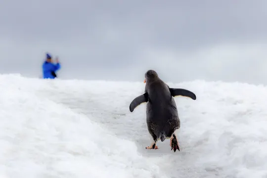 一只企鹅在雪地中笨拙却坚定地朝着远处的人影走去,而远处的人正在拍摄企鹅的身影。 企鹅略显滑稽的姿态和远处模糊的拍摄者形成对比,展现了人类与自然的和谐共处。