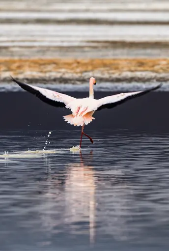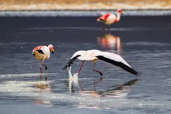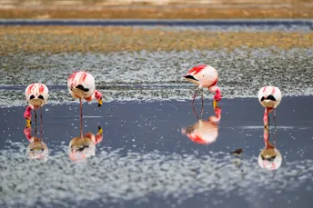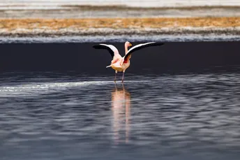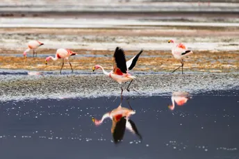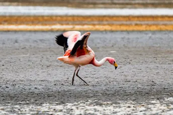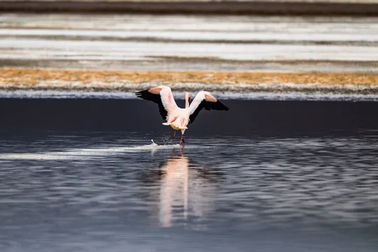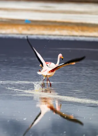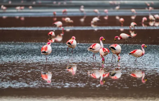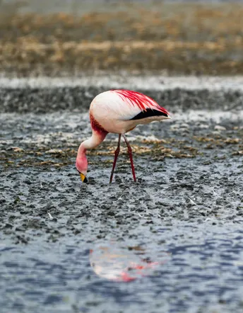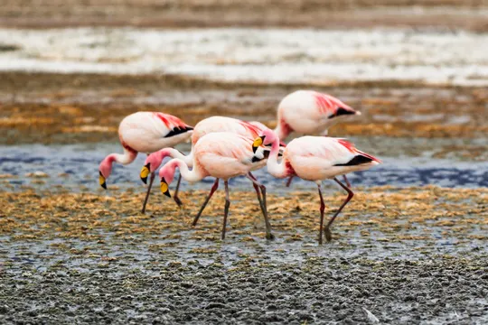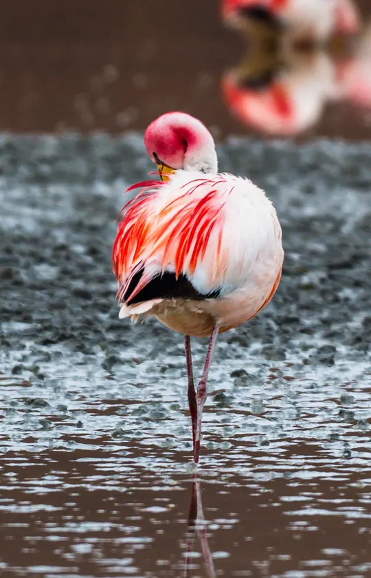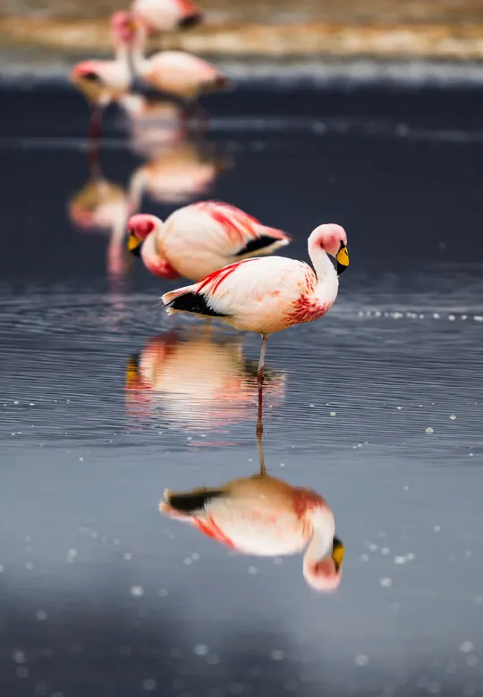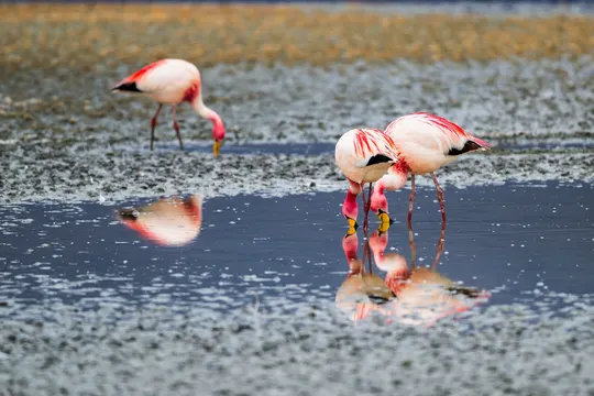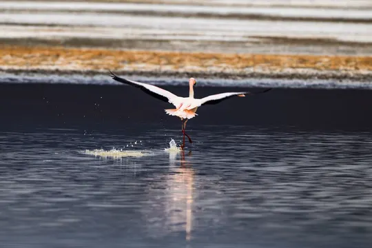 安第斯火烈鸟(Andean Flamingo,学名:Phoenicoparrus andinus)是玻利维亚高原湖泊的标志性鸟类之一,也是最稀有的火烈鸟品种之一。它主要分布在安第斯山脉的高海拔地区,包括玻利维亚、智利、秘鲁和阿根廷的咸水湖和湿地。 安第斯火烈鸟的特点 1. 体型: • 安第斯火烈鸟是体型较大的火烈鸟,身高约1.1-1.4米。 • 重量通常在2-2.5千克之间。 • 翼展可达1.5米。 2. 外观: • 身体大部分呈淡粉色。 • 翅膀上有黑色飞羽,飞行时尤为醒目。 • 喙为黄色,喙尖是黑色的,这是它与其他火烈鸟(如智利火烈鸟)的显著区别。 3. 栖息地: • 安第斯火烈鸟喜欢栖息在高海拔的盐湖(如玻利维亚的乌尤尼盐沼和彩色湖泊Laguna Colorada),这些湖泊通常含有丰富的微藻。 • 它们通常生活在海拔3000-4500米的地区,适应寒冷和高盐度环境。 4. 食物: • 主要以盐湖中的微藻为食。 • 喙形独特,适合过滤水中的藻类和浮游生物。 5. 繁殖: • 它们在咸水湖附近的泥地筑巢,巢呈小火山状,用泥土堆成。