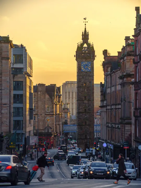 阳光倾泻的洒在忙碌的街道上,照亮了建筑的一侧,匆忙的行人和拥挤的车流与远处古老的建筑形成了强烈对比,让人仿佛穿越时空。