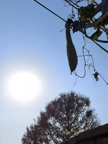 墙头一株小小的绿植,晒着冬日暖阳,仰望天空,仿佛静静地对着垂挂着的丝瓜诉说着岁月的故事。日光、绿植、矮墙头、丝瓜、晾衣钢绳、墙内大树……彼此遥相呼应,组成了一幅唯美的画面。