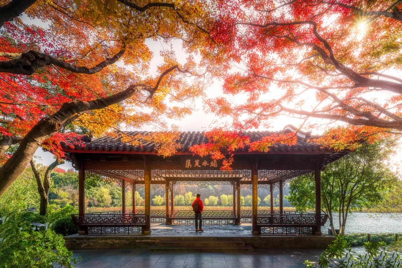 西湖绿水芙渠凉亭两侧,红枫如游龙般向上延伸,充满生命力的极致秋景