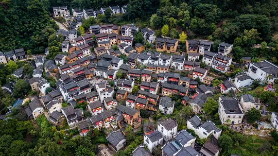 婺源篁岭古村晒秋场景,每年秋季丰收时节,篁岭古村家家户户都开始在屋顶以及其他各处晒各种颜色的农作物,名为“晒秋”,给古朴的村庄多了一层艳丽的色彩。篁岭村是婺源典型的山地型古村,四面山麓缓坡,,隔着山谷,有大潋山等生态屏障,形成适宜人居的小环境。
