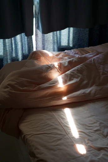 一道光透过窗帘打在床上,这一瞬间拥有隽永的美感。
