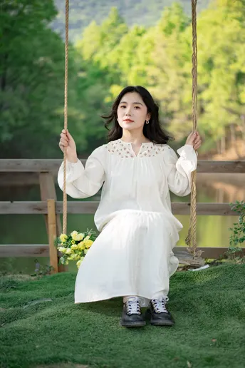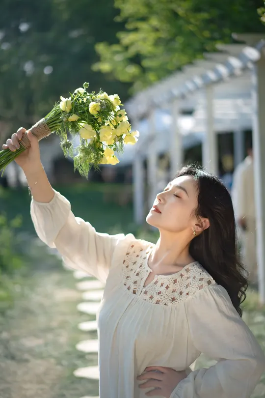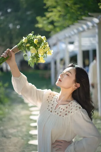 在一个阳光明媚的春日,微风轻轻拂过脸颊,带着丝丝缕缕花朵的芬芳。晓妍穿着她那件喜爱的白色钩花上衣,漫步在公园的小径上。 周围的一切都像是被大自然精心装扮过一般,绿意盎然的草地像是柔软的地毯,在阳光的照耀下闪烁着光芒。树上新长出的嫩叶在微风中沙沙作响,仿佛在轻声诉说着春天的故事。 晓妍路过一片盛开的花丛,那明晃晃的黄色花朵吸引了她的目光。她忍不住蹲下身子,轻轻采撷了一束,捧在手中。花朵们簇拥在一起,像是一小团温暖的阳光,明亮而又灿烂。 她站起身来,将花束高高举起,仰起头,微微闭上双眼,尽情享受着这春日阳光洒在脸上的惬意感觉。在这一瞬间,所有的烦恼都仿佛被抛到了九霄云外,她的心中满是对生活的热爱和对这美好春日的感恩。