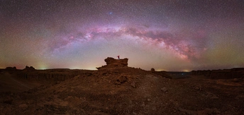 只是一组拍摄于新疆哈密大海道的银河拱桥,通过星曜12mmF2.8多张拼接拍摄完成,每张通过赤道仪曝光120秒。上下两排拼接,累积11张。 第一张通过改机曝光到的银河部分,最后一张通过双窄带滤镜曝光拍摄。后期通过registar ps ptgui软件拼接对齐再调色完成。