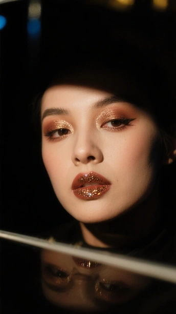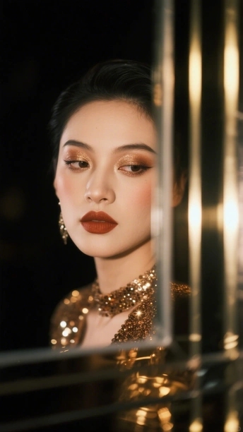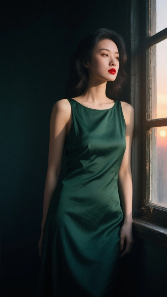 在白昼的光里 绿裙轻裹,静立窗前 眉梢藏着细腻的情 唇角勾着恬淡的柔 当夜幕拉开帷幕 化身为不羁的火 亮片闪烁,妆容夺目 眼神如星芒,划破沉默 **色彩:** 色彩搭配整体和谐,墨绿色背景与裙子和红色唇彩形成了对比,烘托出人物的古典美。 **光影:** 光线方向明确,从窗外打入,在人物面部形成明暗对比,很好地塑造了轮廓。不过,阴影部分稍显生硬,缺乏柔和过渡。 **构图:** 构图较为稳定,人物位于画面右侧,视线方向留有空间,符合“视线引导”原则。然而,主体略显拥挤,适当留白可能效果会更好。 **后期处理:** 后期处理整体自然,但颗粒感略重,可能是为了增加复古感,但稍有过犹不及。 **情感共鸣:** 照片营造出一种宁静、忧郁的氛围,容易让人产生共鸣。但这种情感表达较为含蓄。 总的来说,这是一张不错的作品,但还有提升空间。