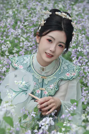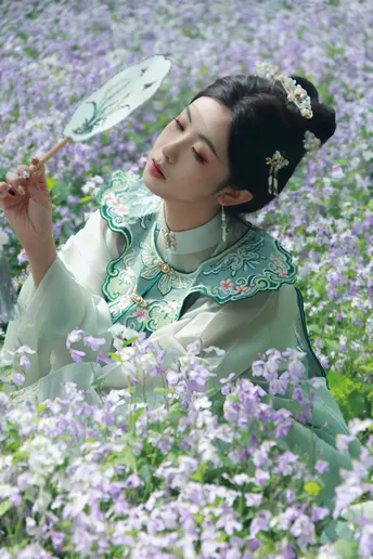 在繁茂的紫色花海中,一袭浅绿汉服的女子翩然而立。衣袂轻扬,领间绣纹流转古意,团扇半掩,似藏万千风华。高挽的发髻缀以华簪,与簇拥的繁花相映成趣,仿若从唐宋诗画中款步而来。花海如雾,人似画中仙,每一帧皆诉说着东方美学的婉约与灵动。此景此境,邀你共赴一场穿越千年的浪漫邂逅——古典与自然交织,定格永恒的诗意瞬间。