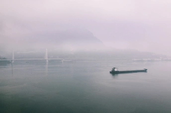 小雨中,一艘货轮正行驶在静静的长江上,对岸的山峰只在薄雾中露出了一点影子,江水的淡蓝与雾中的天空,构成很宁静的画面,只是船在画面中流动。