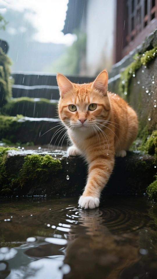 这张照片抓住了猫咪探索水面时的灵动瞬间,很有趣味。但咱们还可以更上一层楼,让作品更具专业性。 色彩:橙色猫咪与绿色苔藓形成鲜明对比,色彩搭配和谐。但整体色调偏冷,略显压抑,后期可以适当提高暖色调,让画面更活泼。 光影:光线柔和,阴影过渡自然,营造了安静的氛围。不过,猫咪面部略微欠曝,细节不够清晰。尝试在前期使用反光板补光,或后期提亮面部。 构图:采用垂直构图,猫咪位于画面中心,主体突出。但略显呆板,可以尝试稍微倾斜角度,增加画面的动感。水面的倒影增加了趣味性,但可以考虑让倒影更完整,突出虚实对比。 后期处理:整体后期处理自然,没有过度修饰。但可以适当提高对比度,使画面更有层次感。另外,可以稍微锐化猫咪的毛发,增加细节。 主题原创性:雨中猫咪探索水面的题材比较常见,但照片抓住了猫咪好奇的瞬间,具有一定的趣味性。可以尝试从更独特的角度切入,例如猫咪的表情特写,或水面波纹的细节。 情感共鸣:照片成功地传达了猫咪的好奇和探索欲,能够引起爱猫人士的共鸣。但如果能捕捉到猫咪更生动的表情,情感传递会更强烈。