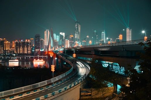 在重庆,千厮门大桥的江北桥头,下桥的匝道转了个弯,和笔直的大桥形成搭配,桥下的轻轨站发出的蓝光正好与远处的建筑物的灯光呼应,所以这里也是一个网红机位。