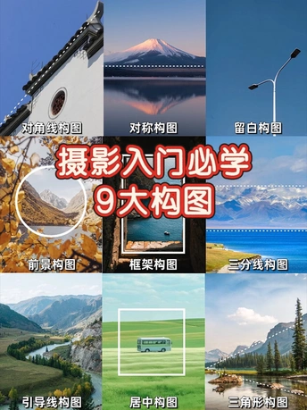 新手学摄影总拍得像游客照? 其实90%的废片都是构图没选对! 整理了摄影师私藏的9种万能构图,看完直接套用👇 1️⃣居中构图 2️⃣引导线构图 3️⃣三角形构图 4️⃣对角线构图 5️⃣三分法构图 6️⃣对称构图 7️⃣框架构图 8️⃣前景构图 9️⃣留白构图 具体内容看笔记哦! 希望大家学会之后都用起来!拍出大片!