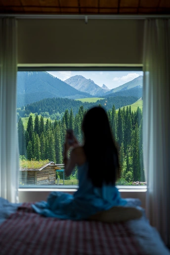 一位女子穿着蓝色连衣裙坐在床边,正拿着手机对着窗外拍摄。窗外是一片美丽的自然景观,有茂密的森林和连绵的山脉,山脚下还有一座带有绿色屋顶的木屋,整个场景显得非常宁静和惬意。
