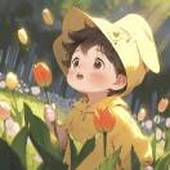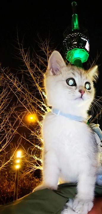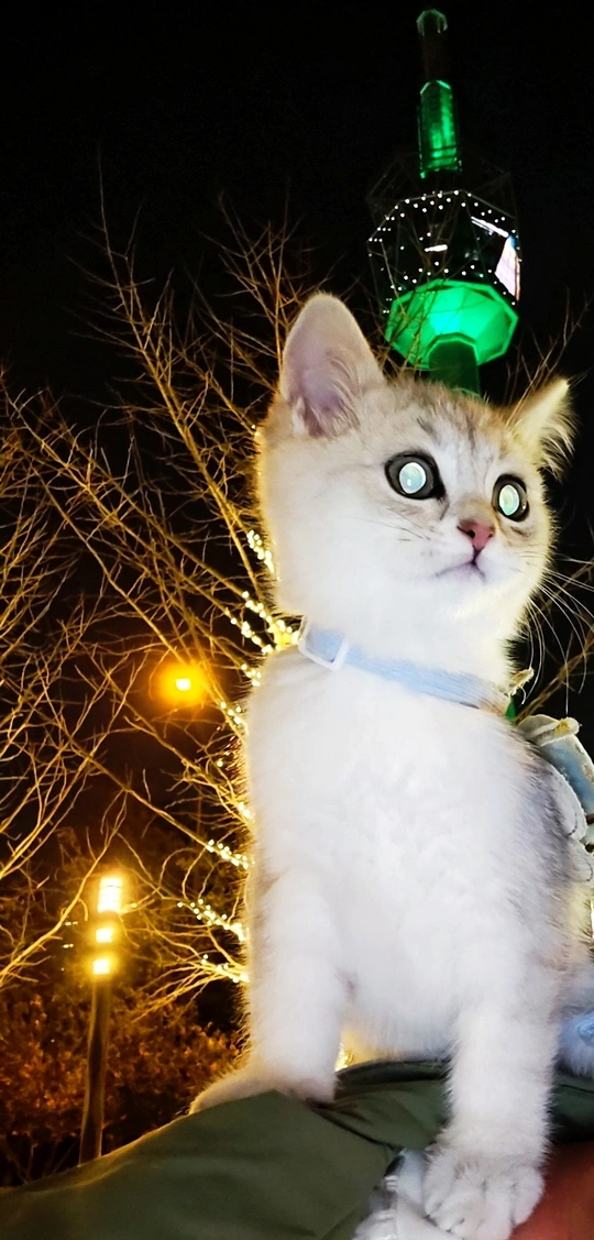 画面中是一只可爱的小猫,毛色主要为白色,耳朵竖起,眼睛在夜色中闪着光,脖颈处系着浅蓝色的项圈。它被人托举着,背景是夜晚的场景,有发光的树木和一座绿色的塔状建筑,灯光营造出温馨的氛围,整体给人一种温暖美好的感觉。
