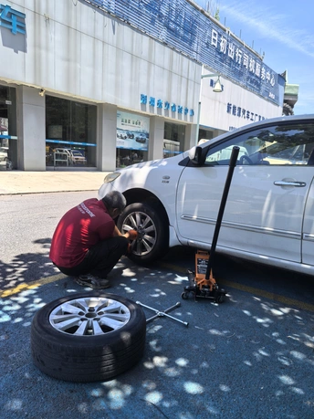 车子轮胎吃了个钉,修车师傅在大夏天里的中午还在辛苦地帮忙换轮胎。似火的骄阳,婆娑的树影,蹲着的师傅,待修的车子,静躺的轮胎,一切皆是美景。