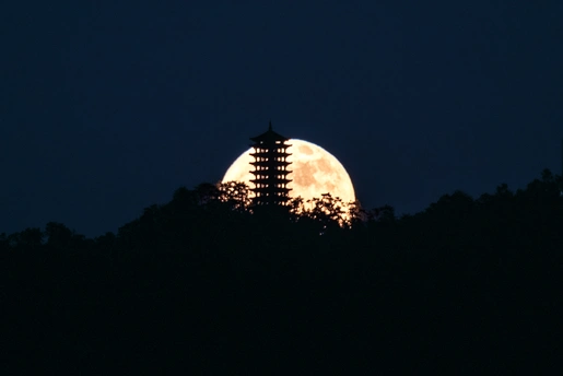 这是月圆之夜,拍摄的重庆缙云山的塔。我们驱车五十多公里,在这郊外等候月亮升起。当时的环境十分安静,除了鸟鸣,什么声音也没有,时间过得十分的慢。山的那边渐渐红起来了,月亮升起来了。赶快按下快门,还没有时间多思考,月亮就升得老高了。又感觉时间过得太快了。