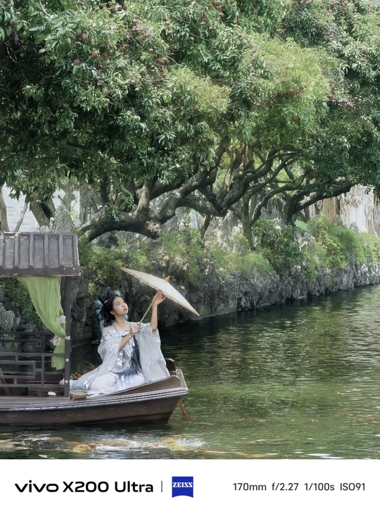 画面中,一位身着飘逸汉服的女子优雅地坐在小舟之上,手中撑着一把古风纸伞,尽显温婉气质。小船悠然漂浮在碧波之上,周围绿树成荫,枝头果实累累,营造出一幅静谧而唯美的古风画卷,仿佛将人带入了诗意的古代情境之中。