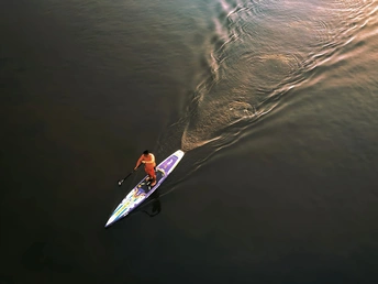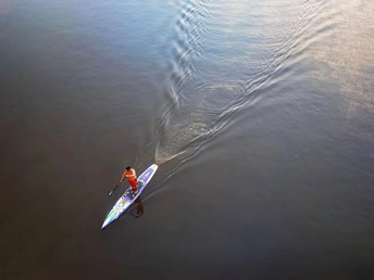 一叶轻舟在黄昏之下轻轻划破这宁静的水面。休闲、放松、自得其乐。