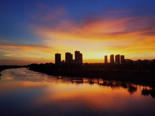黄昏时刻,远处的天空展现出一片橙黄色的色彩,在水面的趁托下,这个城市就象一幅天然的油画般姜丽。