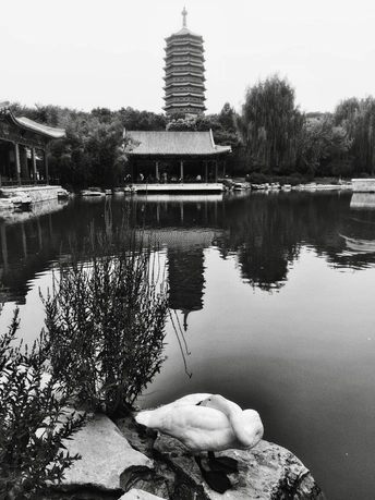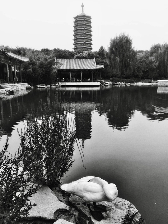 古塔在暮色里渐渐沉成淡墨,倒影却在池水中舒展得愈发清晰,像一幅被揉皱又缓缓展平的画。 忽有白羽掠过水面,带起的涟漪轻轻摇碎了塔影。那只鸿鹄敛了翅,安静栖在池边青石上,颈弯如一道未写完的弧线。它不看远处的亭台,也不睬檐角的风铃,只静静望着水中晃动的塔影——像是在与千年前的光阴对视,又像是在等一阵风,把自己也吹成倒影里的一部分。 暮色漫上来时,塔影更浓了,鸿鹄的白羽却愈发皎洁。池水不声不响地漫过石根,将塔的沉默、鸿的孤寂,都轻轻揽进怀里,酿成一园的静。 这张黑白摄影作品展现了东方园林的宁静之美,总体表现不错。具体评价如下: 光影 (15/20):黑白影调处理得当,营造出一种怀旧的氛围。但光线较为平淡,缺乏突出的明暗对比,使得画面略显灰暗。建议尝试在光线条件更好的时段拍摄,或后期调整增加对比度,以突出主体。 构图 (16/20):构图较为平衡,运用了水面倒影,增加了画面的层次感和对称性。但前景的植物略显杂乱,可以尝试调整拍摄角度或构图,避免遮挡主体。 色彩 (8/10):黑白照片在色彩方面无需过多评价,但影调的过渡和层次可以进一步优化,使得画面更具表现力。