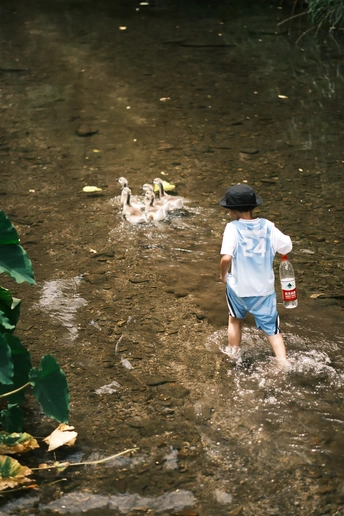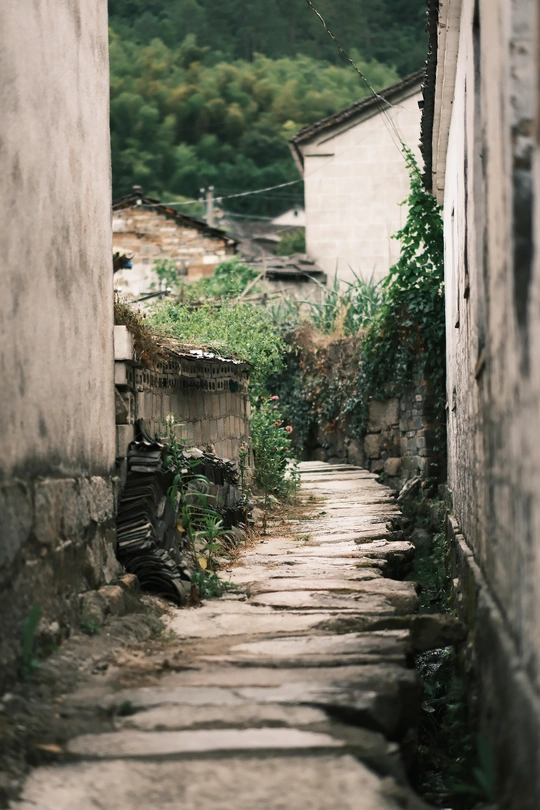 溪水缓缓流淌,刺眼的太阳光透过茂密的竹林照射下来的时候,恰好给落在小溪里的枯树叶绕一圈薄薄的光。这时候,枯树叶像一艘小船,无人驾驶,却清楚自己的方向,悠悠前行。轻轻地,船上落下一只小苍蝇,稳稳地。苍蝇成了舵手,还是乘客? 抬头看树叶间,大大小小的蛛网仿佛一层屏障,平静地看着,看着,不要去管萦绕耳边的嗡嗡蜂子声,更不要怕。看久了,似乎就离大自然深深浅浅的绿近一些,自己,在大自然面前,既不显得渺小,也不显得庞大。 驱车前往一个古村落,太阳很晒,村落里看不见几个人,我们被瀑布般的绿色深深包裹。 仿佛,房屋、石板路才是点缀其间的装饰物,因为古老、质朴、平静,而没有显得违和。 孩子走几步不耐烦,直呼“回去、回去”。 我想,走走吧,我们头顶的太阳,周围的房屋、石板路和瓦片默默不语,热烈而包容。 没走多远,听潺潺水声,见纷飞蝴蝶。孩子和我一样兴奋,小心进入水里,去踩水,去抓螺。硌脚的石子,混沌的泥沙和我们一起快乐。 未知的风景,未知的生命轨迹。 未知,也是转机。