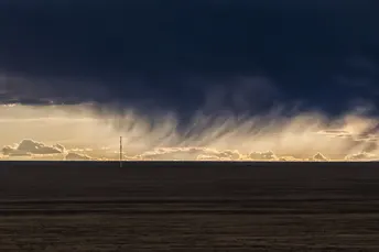 乌云如巨大的穹顶倾压而下,将天空揉成深褐的褶皱,地平线如沉默界碑,把世界劈成“暗云剧场”与“荒原深渊” 。丁达尔光撕开云隙的瞬间,神的手指抚过苍茫——金色射线既是天地博弈的裂痕,也是绝望里抽出的希望脐带 。 孤独电线杆垂直插入荒原,纤细电线串起人类文明的“微弱证词”:它渺小如沙,却固执立成“对抗虚无的锚点”。当暖金光线撞上冷褐荒原,荒原不再是绝望容器,而是“孤独者的共鸣腔”——我们何尝不是天地间的电线杆?在人生乌云压境时,用微弱存在接住穿云的光,把“渺小”站成“辽阔”,把“困境”等成“神性馈赠”。 这是自然写给人类的隐喻:乌云终会流动,光线从未缺席,而荒原上每一次驻足,都是与灵魂辽阔的相遇——你看,连最孤独的坚持,都能在天地间,雕出光的形状 。