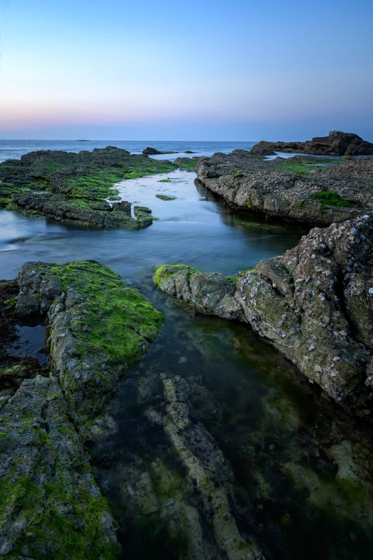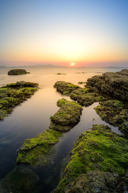 暑期的海边总被挤得满满当当,索性往小众角落钻了钻,挖到几个能安静看日落的扫海机位—— 图1-3 养马岛海岸礁石 退潮后礁石群会露出棱角,落日把海面染成橘色时,浪花拍在礁石上的白边格外分明,蹲低角度能框进海天和礁石的层次感 划重点:礁石区尤其退潮后容易有苔藓,踩上去特别滑,一定要穿防滑鞋慢慢走,安全第一