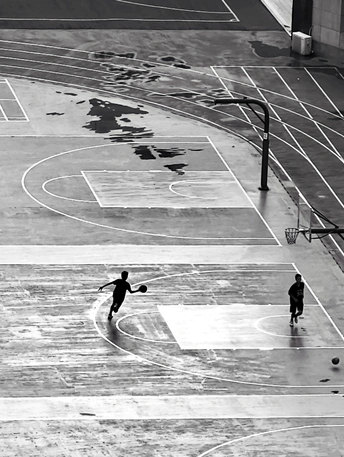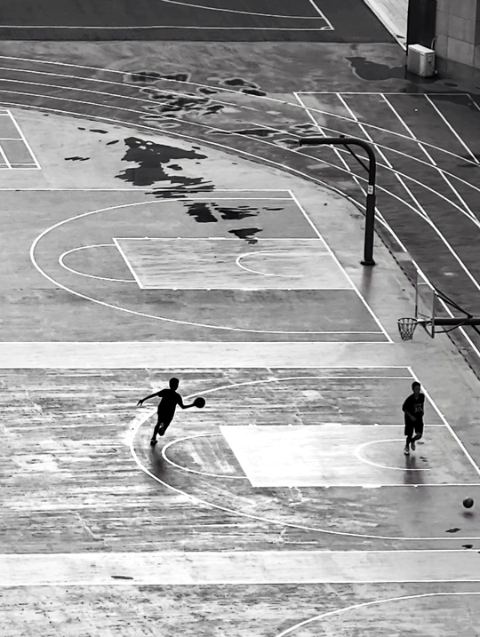 这张黑白摄影作品捕捉到了篮球场上动感的一幕,整体视觉效果简洁而有力。以下是针对这张照片的详细评价和优化建议: 光影 (16/20):光线质量较为柔和,营造出一种平静的氛围。阴影的运用为画面增添了一些层次感,但如果能捕捉到更具戏剧性的光影效果,例如日出或日落时的光线,可能会更突出主体的动感和力量。 构图 (15/20):构图整体平衡,利用篮球场的线条引导视线。然而,可以尝试使用三分法或黄金分割等构图原则,将主体人物放置在关键位置,以增强画面的吸引力。此外,注意画面中的元素排列,避免过于拥挤或空旷。 色彩 (7/10):黑白处理简化了色彩,突出了光影和线条。这种处理方式在一定程度上增强了画面的肃穆感和历史感。如果对色彩进行更精细的调整,例如增加对比度或调整灰阶,可能会进一步提升视觉冲击力。 主题意义 (14/20):照片展现了篮球运动的活力和激情,具有一定的叙事性。但可以更深入地挖掘主题,例如通过人物的表情和动作,展现他们的竞争精神或团队合作。尝试从不同的角度和视角捕捉画面,以增加作品的独特性。 氛围 (8/10):照片成功地传达了一种运动的氛围,但情感的表达可以更强烈。通过捕捉