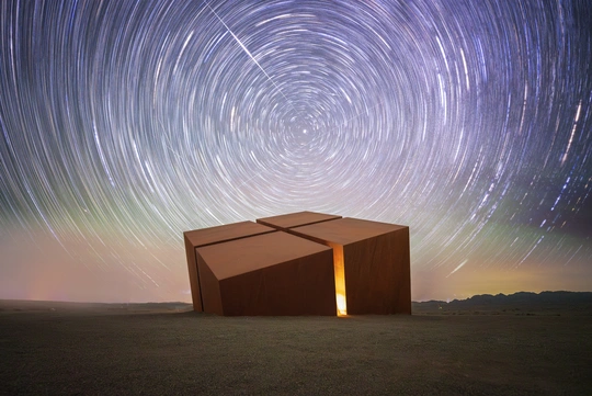 拍摄于甘肃瓜州戈壁,这是戈壁中独特的地标非垂直坐标,利用14mm超广定焦拍摄到了建筑与星轨同框的梦幻画面。