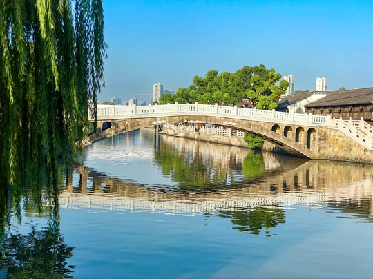 古桥横卧流水,桥影与波光叠成韵律。垂柳轻拂,新旧建筑在远处对话,水乡的柔与城市的刚相融,一帧画面,藏着时光交织的独特韵脚