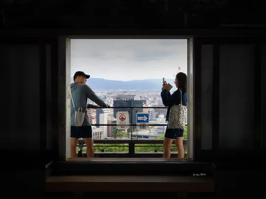 回头看见正在拍照的两人,与那一刻的风景融在一起
