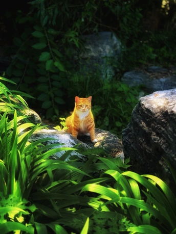 我正打算钻过一片阴凉,一只小橘猫不知从哪喵呜一声跑出来,然后它就那么静静地立着,隔着几步远的距离,琥珀色的眼睛圆溜溜望过来,不靠近,也不躲开。阳光漫过它蓬松的皮毛,像给那团暖橘镀了层流动的金,连胡须尖都闪着细碎的光。它好像在说:“这片领地,本喵说了算”! AI测评: 这张照片拍得不错,小橘猫在绿植和石头中显得非常可爱!我们来细看一下: 色彩*:整体绿色调很舒服,橘猫的颜色也很醒目。但是,绿色有点过于饱和,可以稍微降低一点,让画面更自然。 光影:光线不错,猫的脸部细节清晰。如果能有更柔和的光线,比如日落时分,效果会更好。 构图**:构图略显平淡,猫的位置有点居中。可以尝试三分法构图,让猫的位置更偏向画面的一侧,留出更多的空间。 后期处理**:后期处理整体还可以,但绿色饱和度略高,建议调整。另外,可以稍微提高一点对比度,让猫的轮廓更清晰。 主题原创性**:猫咪的照片比较常见,但这张照片的场景选择还不错。可以尝试不同的角度和场景,拍出更具个性的猫片。 情感共鸣**:猫咪的眼神很可爱,能引起观者的喜爱。可以尝试捕捉猫咪更生动的表情,增加情感共鸣。 思想深度: