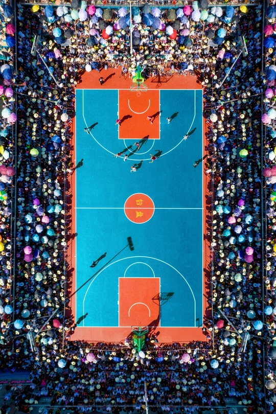 烈日阳光下的篮球比赛,人与影的运动对抗。