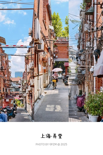 上海弄堂像一条浸在时光里的棉线,细细密密,缝着柴米油盐,也缝着岁月里那些说不尽的软。 晨雾漫进石库门的铜环时,弄堂便醒了。晾衣绳在两墙之间搭起虚线,蓝布衫与格子裙随穿堂风轻轻撞着,像未说出口的絮语。墙根青苔洇着昨夜的雨,砖缝里钻出几茎狗尾巴草,摇摇晃晃,倒比墙头上那尊缺了角的石狮更像这里的主人。 自行车铃从深处滚过来,叮铃铃的,惊飞了窗台上打盹的白猫。穿拖鞋的阿婆端着搪瓷盆出来,盆底的水渍在青石板上洇出小小的云。“张家姆妈,今朝小菜新鲜伐?”“蛮好蛮好,去晚了要被抢光咯!”话音裹着煤炉的烟火气,在潮湿的空气里慢慢散。 午后的阳光斜斜切进来,在地面织出格子。孩子们踩着光影追逐,皮球撞在斑驳的墙面上,弹起一声闷响,惊得墙缝里的蟋蟀停了声。有晾在竹竿上的床单垂下来,挡住半扇窗,窗后传来评弹的弦索,咿咿呀呀,和着远处电车驶过的哐当声,揉成一团软糯的调子。 暮色漫上来时,路灯在檐角亮起昏黄的光。晾衣绳上的衣裳收了,只剩下空荡的绳子在风里晃。谁家的厨房飘出红烧肉的香,混着隔壁炒青菜的清苦,在弄堂里缠缠绕绕。晚归的人踏着自己的影子往里走,皮鞋敲在石板上,声音被两侧的楼房轻轻接住,温温柔柔地送向深处。