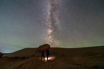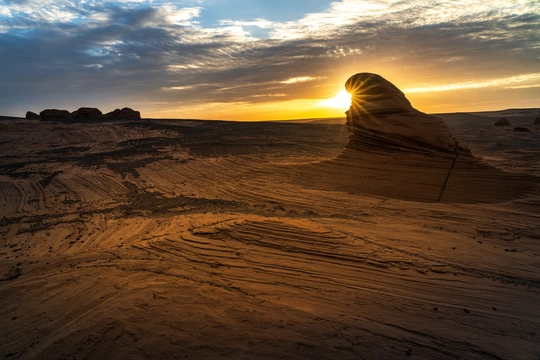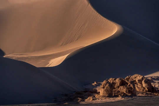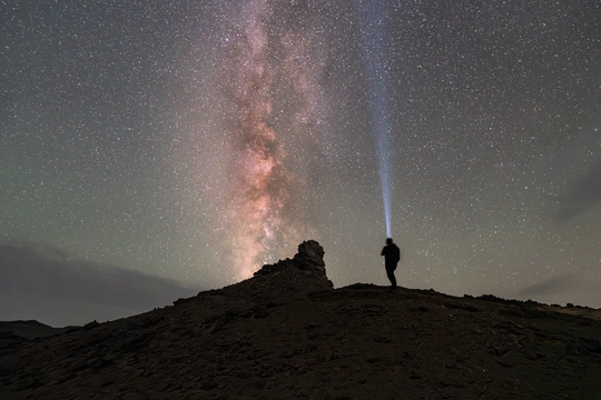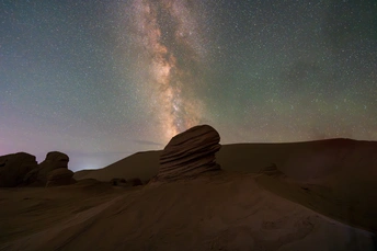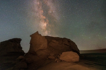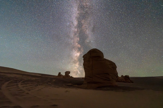 夕阳为小南湖雅丹镀上赤金,风蚀的岩丘如古丝路遗落的城郭,在余晖中渐次沉默。暮色漫过戈壁,星子便从天际漏下,缀满深蓝穹顶。银河如练横亘,与雅丹的剪影交叠,仿佛千年前驼铃摇落的星光,仍在这旷野上流淌。残阳余温未散,星河已铺就通往远古的驿道。