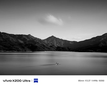 画面中展现了一片宁静的湖水,湖面水波微微荡漾。远处是连绵起伏的山脉,山势巍峨。湖面上有玩桨板的人,在这山水之间显得格外渺小,整个场景静谧悠远,仿佛时间都在此刻静止,给人一种远离喧嚣、悠然闲适的感觉。