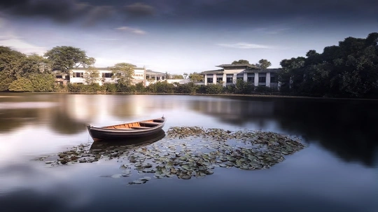 湖面上,一艘小船静静漂浮,周围点缀着大片荷叶,增添了生机与意趣。湖水如镜,清晰倒映出岸边的建筑与树木。岸边,房屋错落,绿树环绕,建筑风格雅致。天空云层厚重,整体氛围清幽宁静,仿佛能让人感受到大自然的静谧与美好,仿佛时间都在此刻慢了下来。