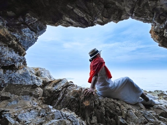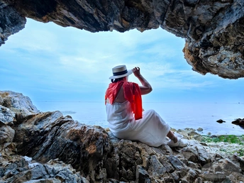 画面向人们展现了洞穴的岩石形态各异,纹理粗糙且清晰,带着岁月侵蚀的痕迹,呈现出深浅不一的色调,有灰褐、暗黄等,仿佛是大自然用时光雕琢出的艺术品。 洞外,天空澄澈,浅蓝色的天幕上,云朵如棉絮般轻盈飘浮,为天空增添了几分柔和。远处的海面辽阔无垠,与天空相接,水色在光线的映照下,泛着淡淡的蓝,似一块巨大的、温润的蓝玉铺展向远方。 一位身影静坐在洞穴口的岩石上,望着眼前的海天盛景。她的存在,让这静谧的自然之美多了一丝人的气息,仿佛在与大自然进行一场无声的对话,整个场景既有着大自然的雄浑与静谧,又有着一种悠然的氛围,令人心驰神往,仿佛能感受到那海风吹拂的轻柔,以及天地间的开阔与安宁。