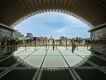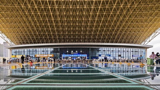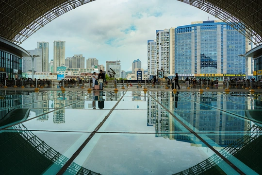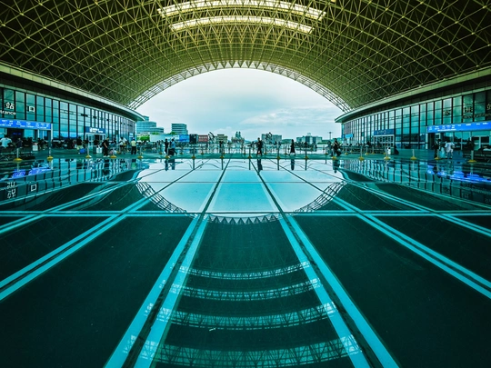 这张照片捕捉到了一个宏伟建筑的内部景象,其特点是巨大的拱形屋顶结构和倒影清晰的地面。构图上,利用对称性,将建筑结构置于中心,引导观众的视线。光影方面,屋顶的结构在地面上的倒影创造了一种有趣的图案,增加了画面的层次感。色彩虽然比较单一,以灰白色调为主,但通过地面的反光,增加了视觉的丰富性。主题意义上,这张照片展示了现代建筑的宏伟和对称之美,同时也反映了人们在建筑空间中的活动。优点在于构图的对称性和对倒影的运用,使得画面既有秩序感又不失趣味性。如果能捕捉到更有特点的光线,例如日出或日落时的光芒,可能会使照片更具吸引力。