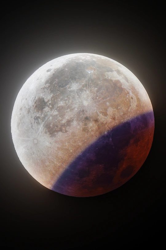月食边缘的光带之所以被称为“绿松石带”,是因为在绝大多数情况下,臭氧层的过滤效应使得蓝绿色成为最显著、最稳定的颜色。 可能出现紫色:紫色是“可能出现的次要色调”。当大气条件极佳,允许更多紫色光透过时,它会与主导的绿松石光混合,形成一种更复杂的蓝紫色。 拍摄时间:(复圆前)2025年9月8日3:43