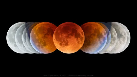 当你看到这张图的时候,你就知道月全食是怎么回事了! 9月8日00:27月亮缺了一角 01:30月亮完全进入地球影子 02:12月亮与地球、太阳连成一条线,抵达最暗的位置 02:53月亮开始脱离地球影子 03:56月亮完全离开地球影子 至此,本影月食完美结束。 (图中顺序从右往左) 拍摄器材:Celestron EdgeHD 9.25"、佳能R5 markii、AM5赤道仪、图谱G3M678M导星相机 拍摄技巧:间隔1分钟拍摄一组5张包围曝光,后期使用PS的camera raw进行HDR合并,地球本影直径为月球直径的2.7倍。