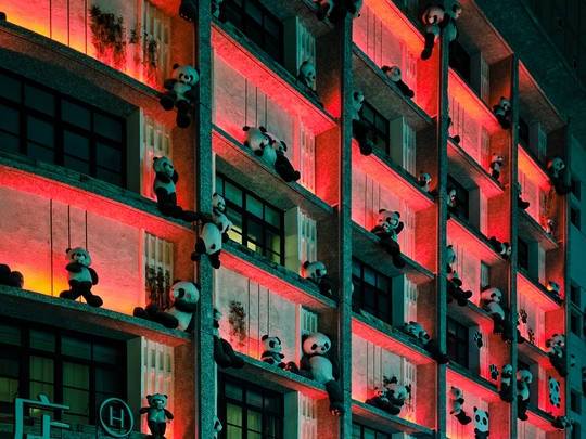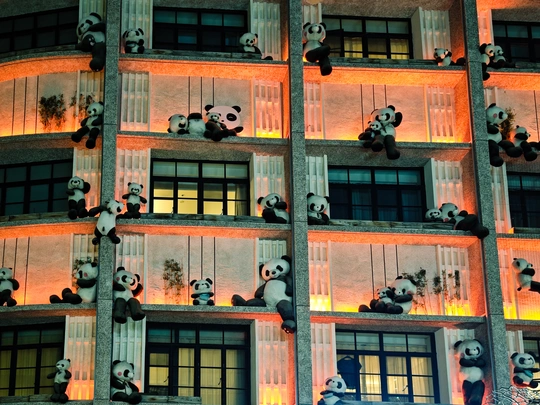 这张照片挺有意思,红色的灯光照亮了整个建筑,熊猫玩偶们像是这座楼房的居民,正在开Party呢!\n色彩:大胆的红色调统一了画面,营造出一种热烈、活泼的氛围,但是红色略微有些过饱和,后期可以适当降低一些,让色彩更自然。\n光影:光线主要来源于红色的灯光,光线比较均匀,缺少一些层次感,如果能捕捉到一些自然光线,会增加画面的趣味性。\n构图:构图比较规整,建筑的线条感很强,但是略显呆板,可以尝试一些倾斜的视角,增加画面的动感。\n后期处理:后期处理整体效果不错,但是红色饱和度略高,可以适当调整一下,让色彩更柔和。\n主题原创性:主题新颖,将熊猫玩偶和建筑结合在一起,很有创意,让人眼前一亮。\n情感共鸣:照片传达出一种欢乐、童趣的氛围,能够引起观者的共鸣。\n思想深度:照片反映了人们对于童年、快乐的向往,具有一定的思想深度。\n总的来说,这张照片的创意很棒,色彩和构图还有提升空间,继续加油哦!