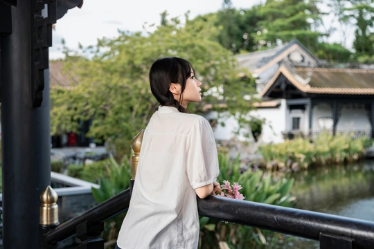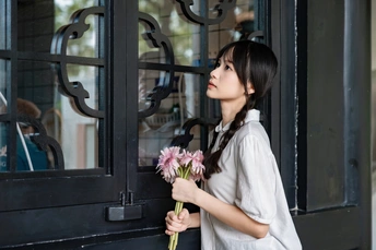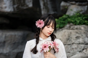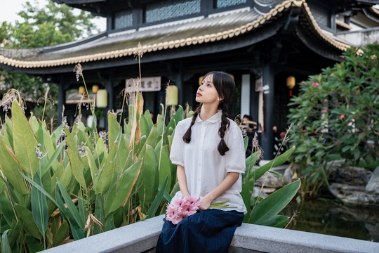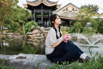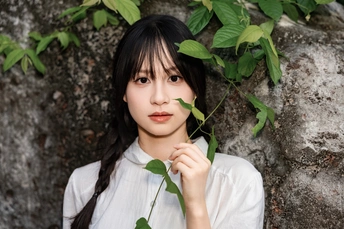 出镜:香菜 地点:广州新文化馆 麻花辫少女捧花静立绿意岩壁间,白衫蓝裙拓印十帧静谧时光,将温柔藏进花瓣与藤蔓的诗行。