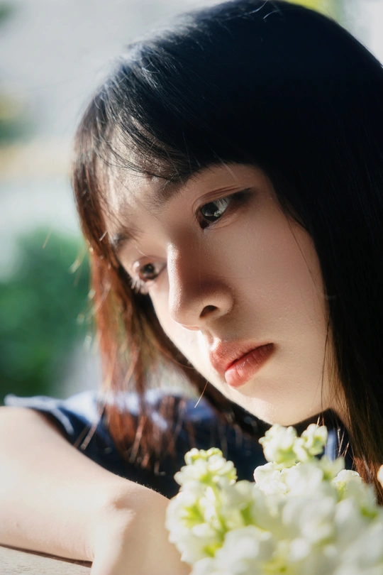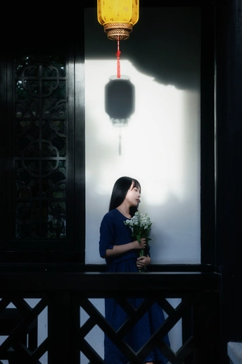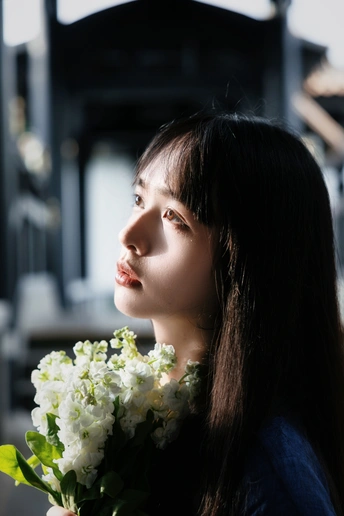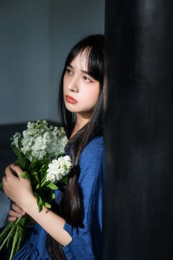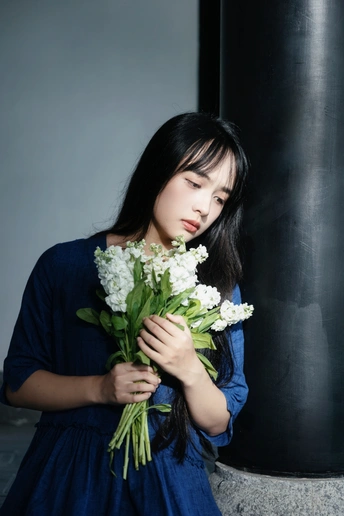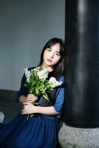 《花语静谧》 出镜:萱萱 地点:广州新文化馆 她捧白花静立深廊,蓝衣黑发拓印时光。 柔光诉尽温婉,花叶低语间藏匿未启的静谧诗行。