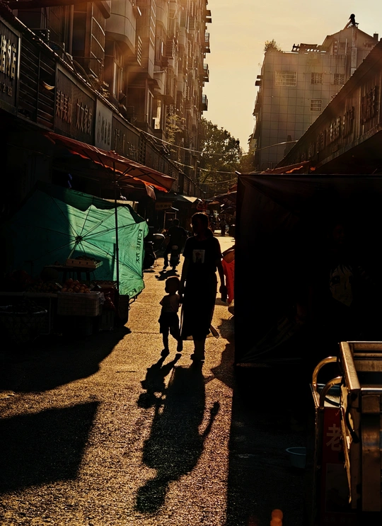 夕阳斜照,将母亲与孩子的身影温柔地投射在小巷的地面上。这幅剪影摄影作品以极简的轮廓勾勒出亲子间无声的羁绊——母亲微微侧身牵起孩童的手,仿佛在引导亦在守护;孩子仰头的姿态透露出对前路的好奇与依赖。狭长的小巷仿佛时间的通道,昏黄的光晕为画面覆上一层怀旧的暖意,暗部的细节与光影的对比让情感沉淀得更加深邃。 这不仅是一瞬的街景捕捉,更是对成长与陪伴的诗意凝视:每一个平凡的归途,都因紧握的双手而成为永恒。