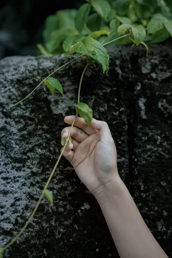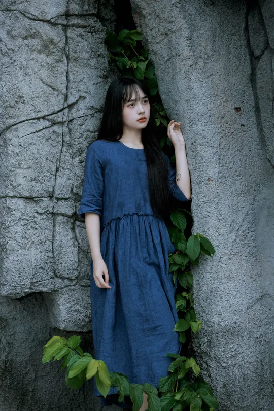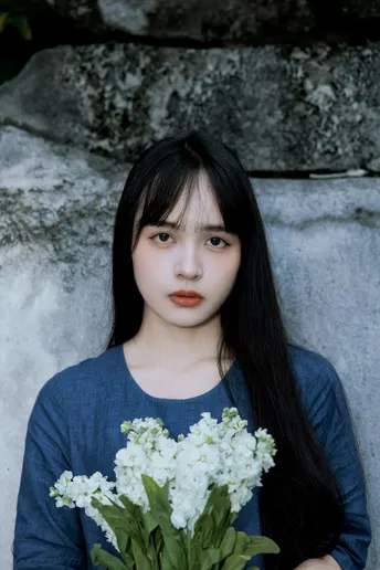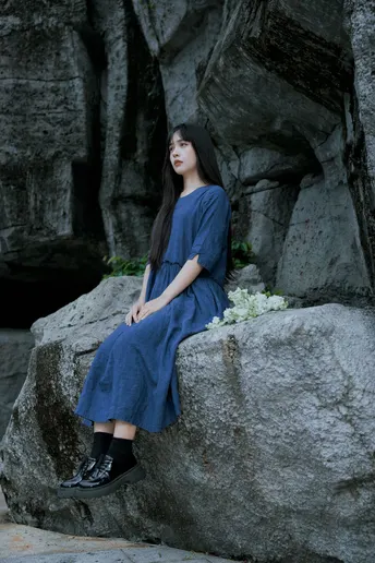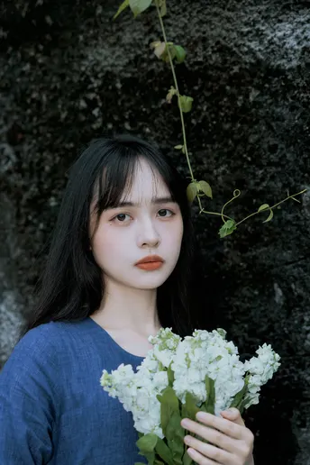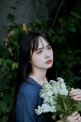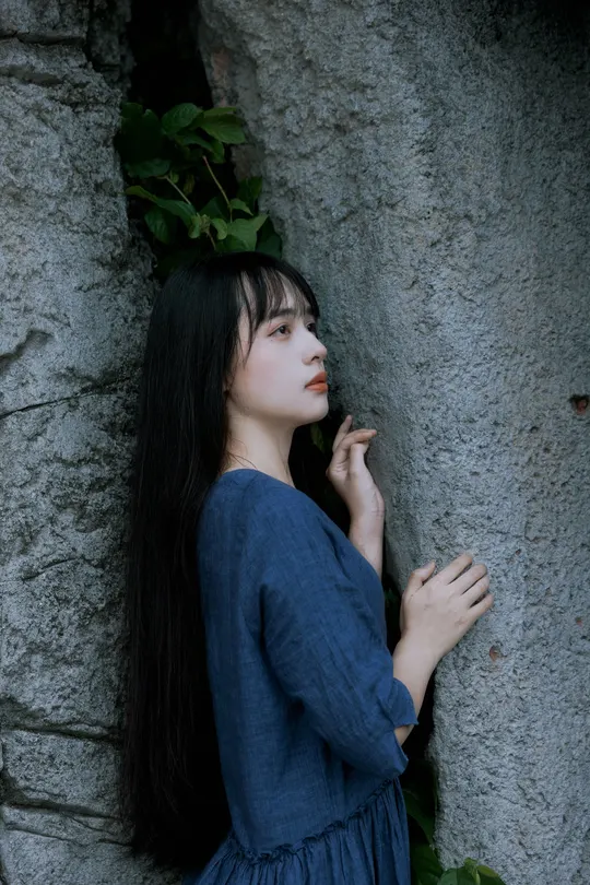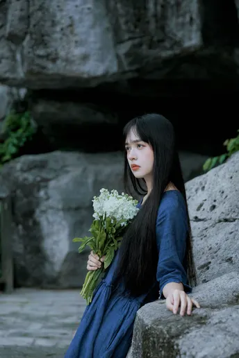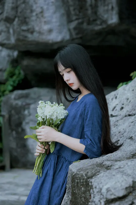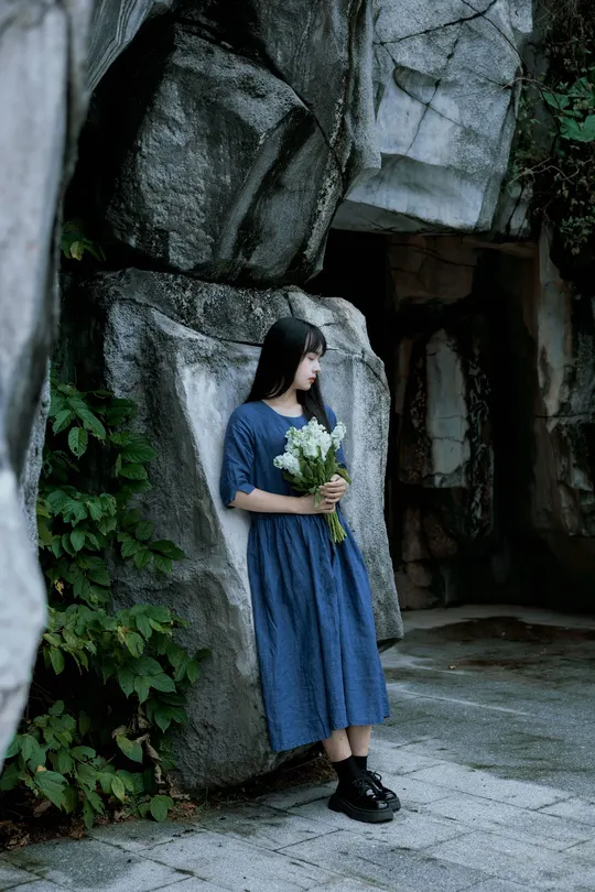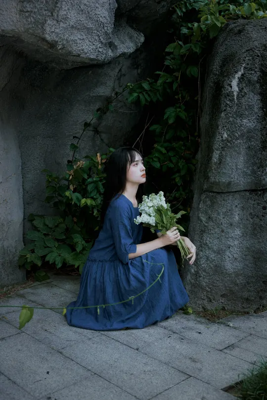 《蓝谧诗》 出镜:萱萱 地点:广州新文化馆 蓝衣少女倚石持花,绿蔓苔痕间静默成诗, 白瓣落处时光温柔封存九帧幽然梦境。