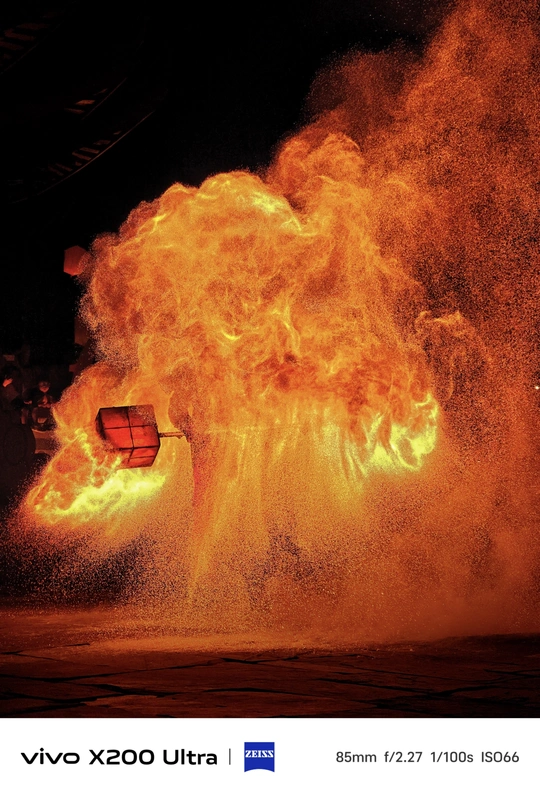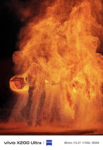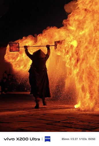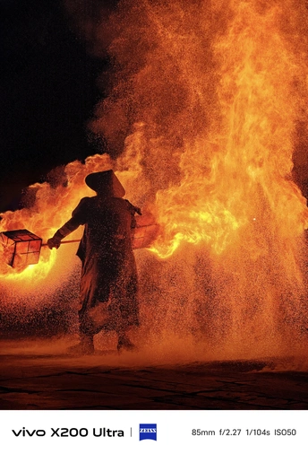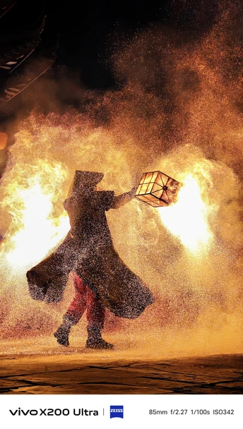 画面中熊熊烈火腾空而起,炽热的火焰散发着耀眼的光芒,仿佛具有强大的能量。隐约可见有人手持物件,似乎在进行某种与火相关的活动,可能是传统民俗活动或特殊表演,整个场景充满了强烈的视觉冲击力和独特的氛围感。