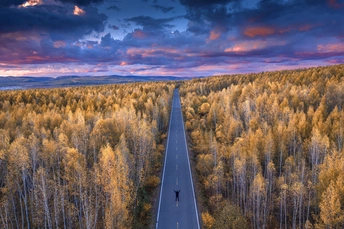 秋意把路铺成金色长卷,云在天际泼洒粉紫晚霞。站在这天地间,张开双臂,像抱住了整个季节的慷慨与浪漫,所有疲惫都被秋光温柔消解。
