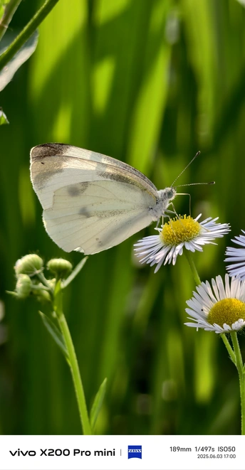 用蔡司镜头捕捉的治愈时刻,一只灰蝴蝶停在一年蓬上,用他细长的嘴允吸着花蜜,这么温馨的画面就用vivo手机记录这一刻吧